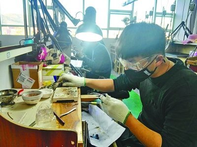 在珠寶加工工作室里,一排排機(jī)器后面,大學(xué)生們正低著頭專心致志加工玉石,有的在雕刻,有的在打磨,其中還有8位來(lái)自緬甸的留學(xué)生。緬甸留學(xué)生相猛江用不太熟練的漢語(yǔ)對(duì)記者說(shuō):"我來(lái)了7個(gè)月,正在學(xué)習(xí)雕刻玉馬。"